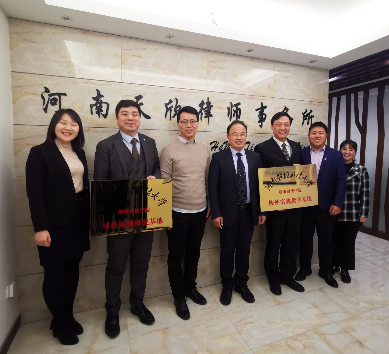 2020年12月11日,beat365院长程政举教授、类案检索研究中心主任朱贺博士赴河南天欣律师事务所参加“创新实践人才培养座谈会”,与该所签署“司法案例研究基地”和“校外教学实践基地”合作协议并举行了揭牌仪式。会上,程政举院长向河南天欣律师事务所主任马斌、副主任袁金波、工会主席付国利、刘孟科等律师颁发了校外实践导师聘书。