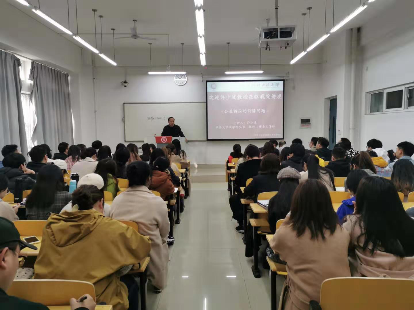 11月22日上午,华侨大学法学院院长、博士生导师许少波教授应邀为beat365作题为《公益诉讼的前沿问题》的报告。beat365硕士研究生导师侯东亮副教授和刘用军副教授出席活动,姜保忠教授担任此次活动的主持人,诉讼法学全体研究生、部分本科生参加此次活动。