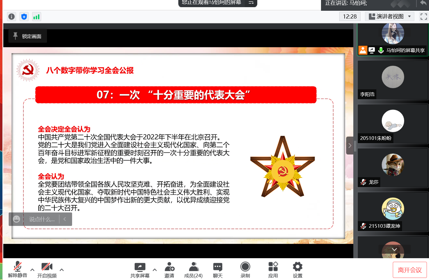 首先,马怡珂对党的十九届六中全会精神的内容作了解读概述,让学员们了解了党在百年间创造的“四个伟大成就”。随后,她列举了“八个数字”并详细解释其含义,让全体学员更加深入地了解全会公报的具体内容。在此期间,马怡珂重点强调了“两个确立”、“牢记一个根本问题”和“四个必须”,使学员们对这三个要点的重要性有了更深一层认知。最后,马怡珂根据全会主要内容总结了全党百年奋斗的历史意义和十个经验,号召全体学员积极贯彻全会精神并将其内化于心,外化于行。
