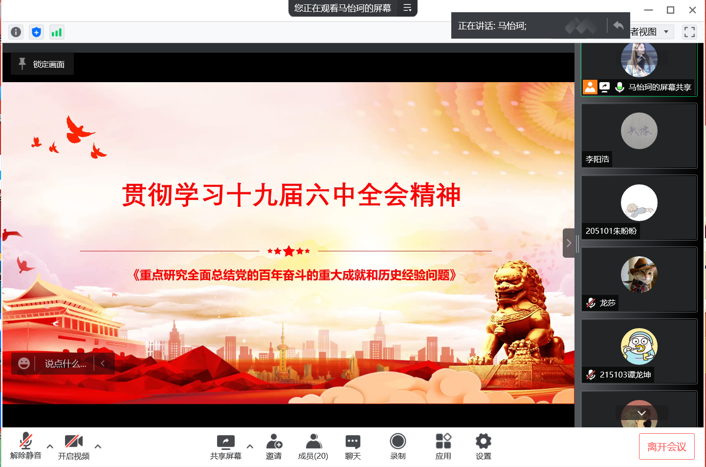 为了落实上级团组织的指示精神,学习贯彻党的十九届六中全会精神,加强大学生思想政治教育,beat365于4月3日晚举行第十二期“青马工程”第五次培训活动。本次活动采取线上方式举行。beat365团校干事马怡珂担任主讲人,2020级与2021级青马工程学员参与本次培训。