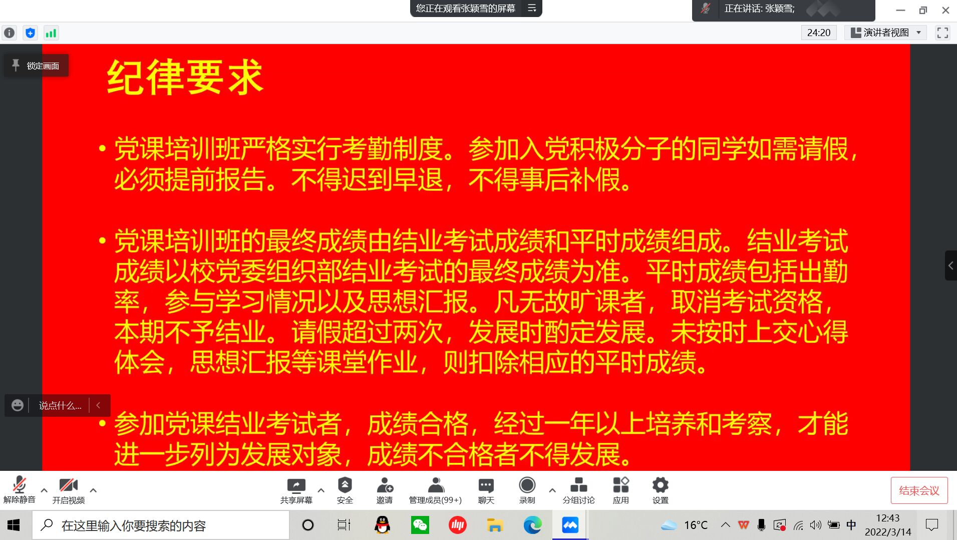 会议过程中,张颖雪介绍了开展党课培训的目的,旨在促进各位积极分子系统地学习党的基本知识和理论,了解党的历史,明确党的性质、纲领、指导思想、根本宗旨等内容。随后,她对习近平新时代中国特色社会主义思想、《中国共产党章程》及入党流程等作了详细介绍并鼓励积极分子主动了解相关知识。最后,张颖雪强调了党课培训的纪律,要求各位积极分子严格实行考勤制度,如需请假,必须提前报告,不得迟到、早退及事后补假。