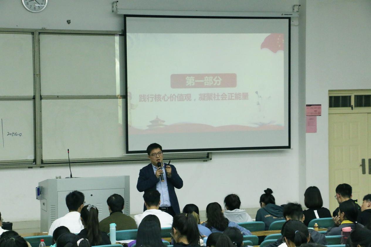 会议伊始,赵志伟书记以社会主义核心价值观为切入点,对其所揭示的国家、社会、公民三个方面的内涵一一展开论述。随后,他强调在座学生应在日常的学习、工作和生活中主动践行社会主义核心价值观,对于遇到的问题要深入思考,透过表面看本质。最后,赵志伟书记通过自己的经历告诉在座学生在以后的工作中要牢记使命、遵法守法,为社会的和谐做出自己的贡献。