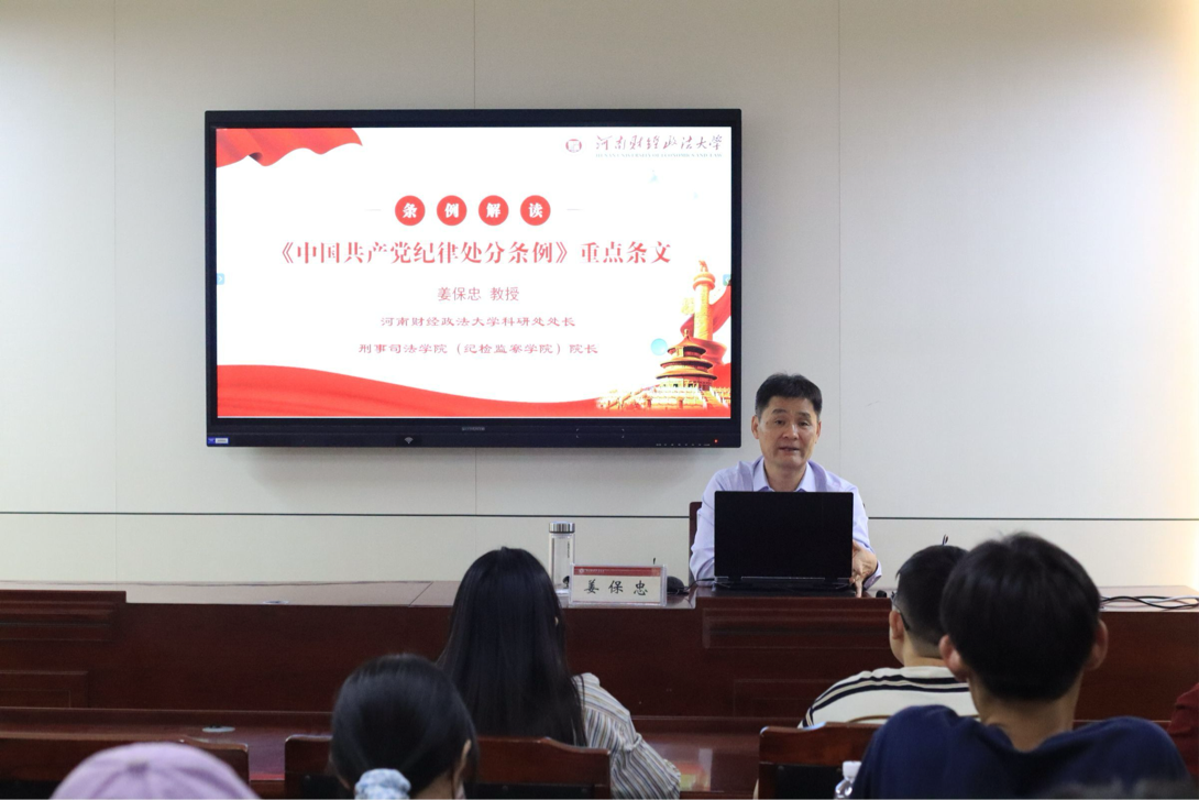 会议伊始,姜保忠院长了解和肯定了在座学生对党的认识和入党的决心,并用“为什么成为公务员的条件之一是具有党员身份”和“法律和政治的关系”两个问题启发学生思考,引出会议主题。他强调:要坚持依法治国和依规治党有机统一,确保党既依据宪法法律治国理政,又依据党内法规管党治党、从严治党。随后,姜保忠院长运用现实案例生动阐释了《中国共产党纪律处分条例》的重点条文,着重强调了党内法规的约束意义。他提醒各位党员发展对象一定要牢记党的指导思想与社会主义初级阶段的基本路线,将“为中国人民谋幸福,为中华民族谋复兴”的初心和使命牢记于心。会议最后,姜保忠院长表达了对学生们未来为中国的建设事业添砖加瓦的美好期待。学生们表示将以此次培训作为新起点,在今后的工作生活中,保持为人民服务的初心和热情,务真务实地完成各项工作。