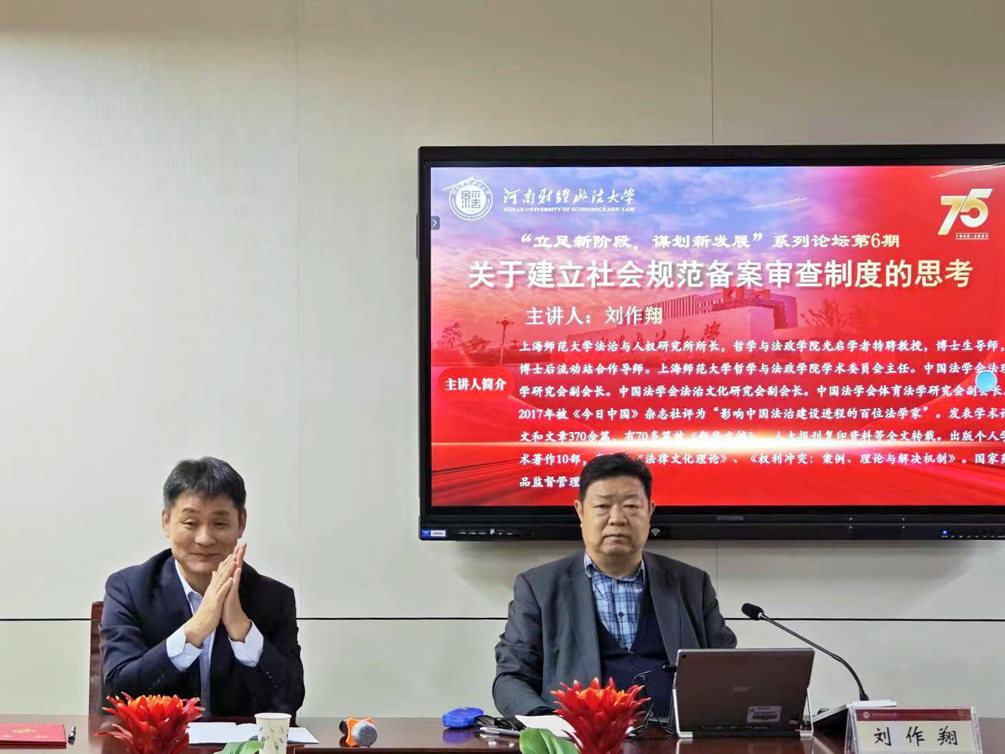 2023年11月7日晚19点,“立足新阶段,谋划新发展”高层论坛第6期在郑东校区举办。beat365亚洲体育在线官网邀请知名学者上海师范大学法治与人权研究所所长,哲学与法政学院光启学者特聘教授,博士生导师,博士后流动站合作导师刘作翔教授作《关于建立社会规范备案审查制度的思考》的学术讲座。讲座由beat365亚洲体育在线官网院长姜保忠教授主持。讲座开始之前,姜保忠院长为刘作翔教授颁发了客座教授聘书。