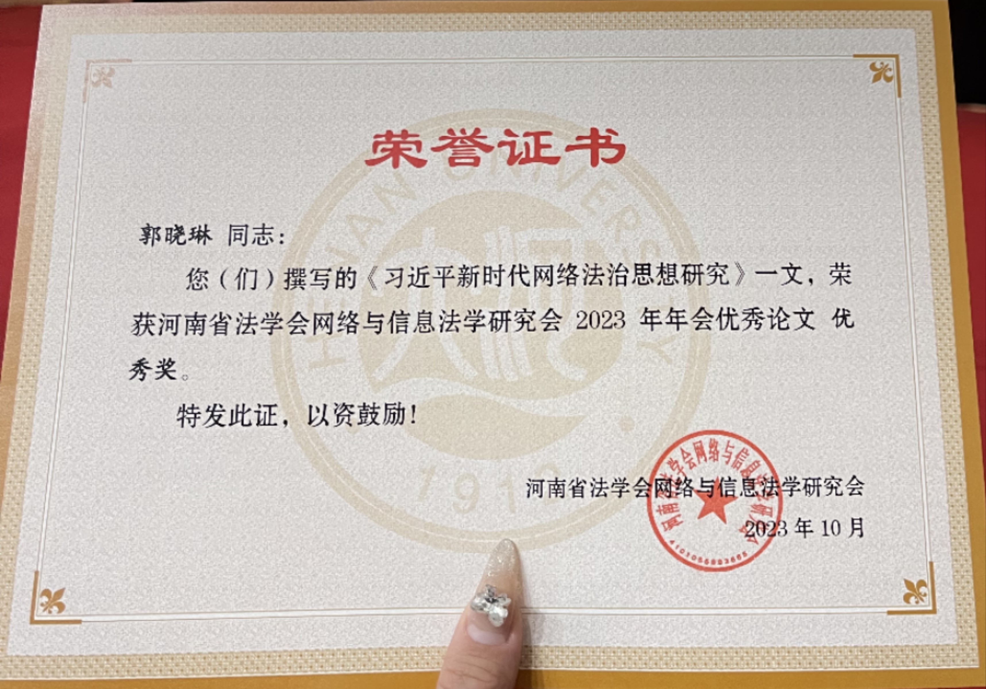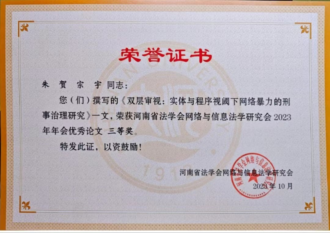 在本次年会表彰中beat365朱贺、宗宇撰写的《双层审视:实体与程序视域下网络暴力的刑事治理研究》一文荣获年会优秀论文“三等奖”;beat3652022级研究生郭晓琳撰写的《习近平新时代网络法治思想研究》一文荣获年会优秀论文“优秀奖”。