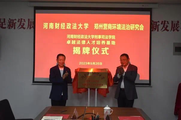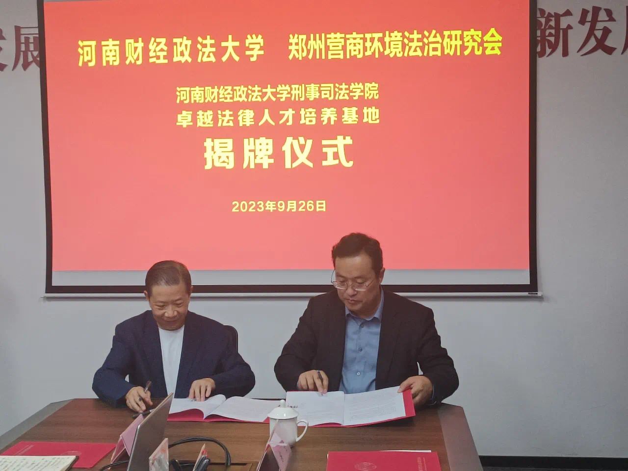 2023年9月26日上午,河南财经政法大学刑事司法(纪检监察)学院与郑州营商环境法治研究会签约暨揭牌仪式在郑州营商环境法治研究会隆重举行。学院党委书记王健、副院长陈在上、党政办公室主任朱贺、学生会主席宗宇与郑州营商环境法治研究会会长张书军、秘书长叶本全、副秘书长刘淑惠、办公室主任胡明国等共同出席了仪式。