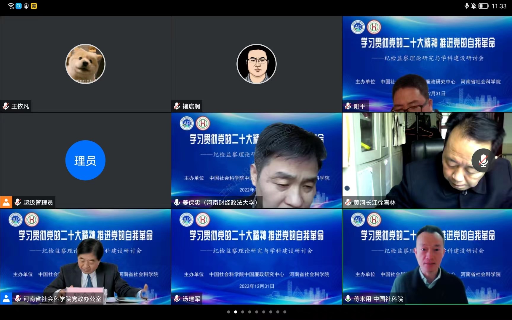 2022年12月31日,由中国社会科学院中国廉政研究中心、河南省社会科学院联合举办的“学习贯彻党的二十大精神推进党的自我革命——纪检监察理论研究与学科建设研讨会”在郑州举行。来自中国社会科学院、湖南省社会科学院、河南省社会科学院、清华大学、西北政法大学、郑州大学、河南大学、河南财经政法大学、华北水利水电大学、焦裕禄干部学院、河南省新乡市纪委监委的专家、学者及纪检监察实务工作者近60余人参加了会议。研讨会采取线上和线下相结合的方式举行。与会人员围绕推进党的自我革命、纪检监察理论研究、纪检监察学科建设等主题各抒己见,展开深入讨论。