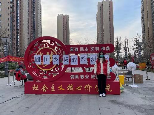 19级学生周佩,在网上得知了家乡正招募核酸检测志愿者的消息,立即报名成为了一名光荣的“红马甲”,帮助村干部通知村民、引导村民有序排队、对过往车辆消毒登记,作为一名大学生,能够参与医护人员和村干部的工作,她倍感荣幸,决心带着这份荣誉与责任继续投身志愿活动。