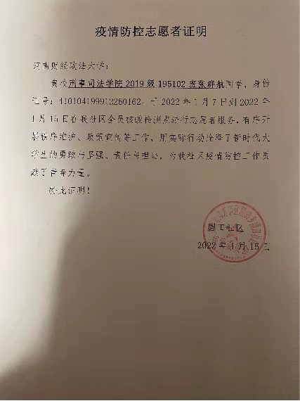 19级学生苏恺阳从1月15日起就在南阳卧龙区新西社区做志愿工作,卡点值守、上门核酸检测、登记社区进出信息,“虽说这些工作不算很重,但也要时刻警惕,做好疫情常态化准备。”苏恺阳说,“尽自己的一份力,发一份热,为社区做出贡献,我义不容辞。”