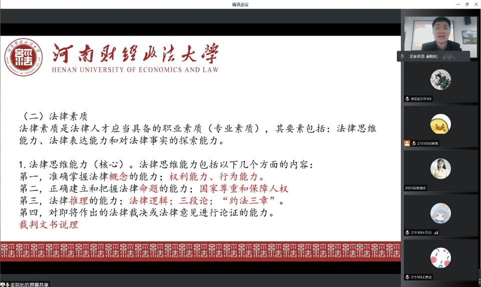 为落实学校开展的“能力作风建设年”活动工作要求,4月7日晚上7点,beat365于教科楼A504举办“法律人才的素质与能力”讲座暨第100期“龙子湖”法学论坛。本次讲座邀请beat365院长姜保忠教授主讲,党委副书记陈俊敏主持,团委书记武仕祯等老师协调组织。讲座采用线上线下相结合的方式进行,以线上为主,beat3652021级200多名本科生和部分研究生参与本次活动,聆听了姜院长的讲座。