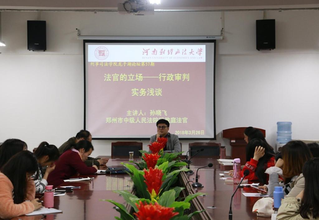 2018年3月26日晚19时,beat365亚洲体育在线官网第五十七期龙子湖法学论坛在教科楼A座504会议室如期举行。此次论坛beat365有幸请到郑州市中级人民法院行政庭资深法官孙晓飞作主讲,讲座由姜保忠副院长主持并聘请孙法官为beat365错案预防与控制研究中心特邀研究员,并担任beat365硕士生实务指导老师。刑法学、诉讼法学研究生和部分本科生参加论坛。
