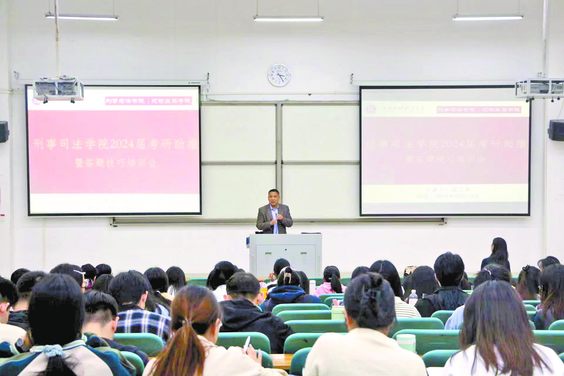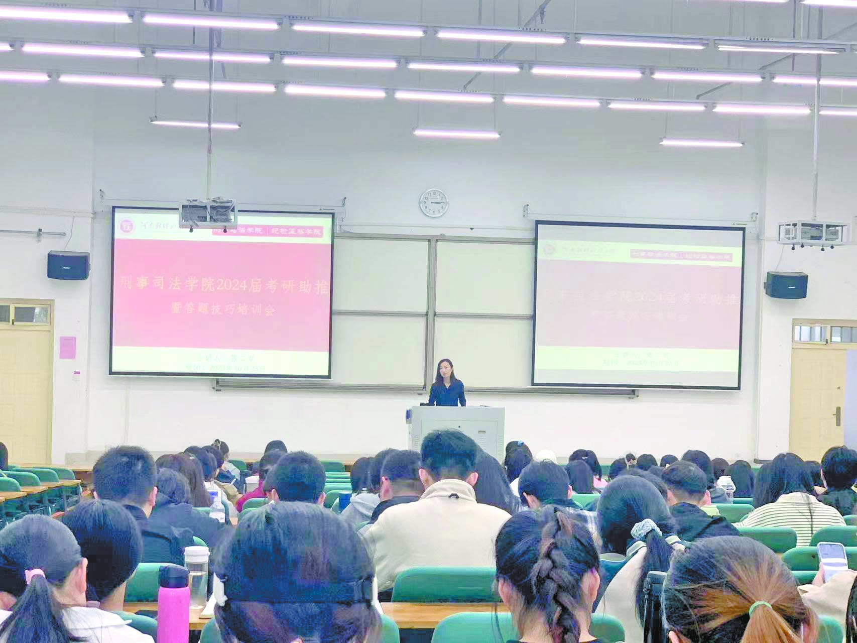张二军向学生详细解读近年来考研形势、考研目的、考研相关要求和考研意义,进一步增进学生对考研相关知识的理解。他围绕刑法学内容进行拓展,向学生具体讲解考试题型、近年的试题发展方向,以及如何高质高效地构建知识体系、拓展知识深度,为学生提供了清晰的备考思路。以往届考研成功学生为例,充分调动学生备考积极性,鼓励学生勇于尝试,认真备考。最后,王梦秋讲述学院相关事宜,并向24届考研学生表达了美好祝愿,激励学生不忘初心,以坚定的毅力奋勇向前。