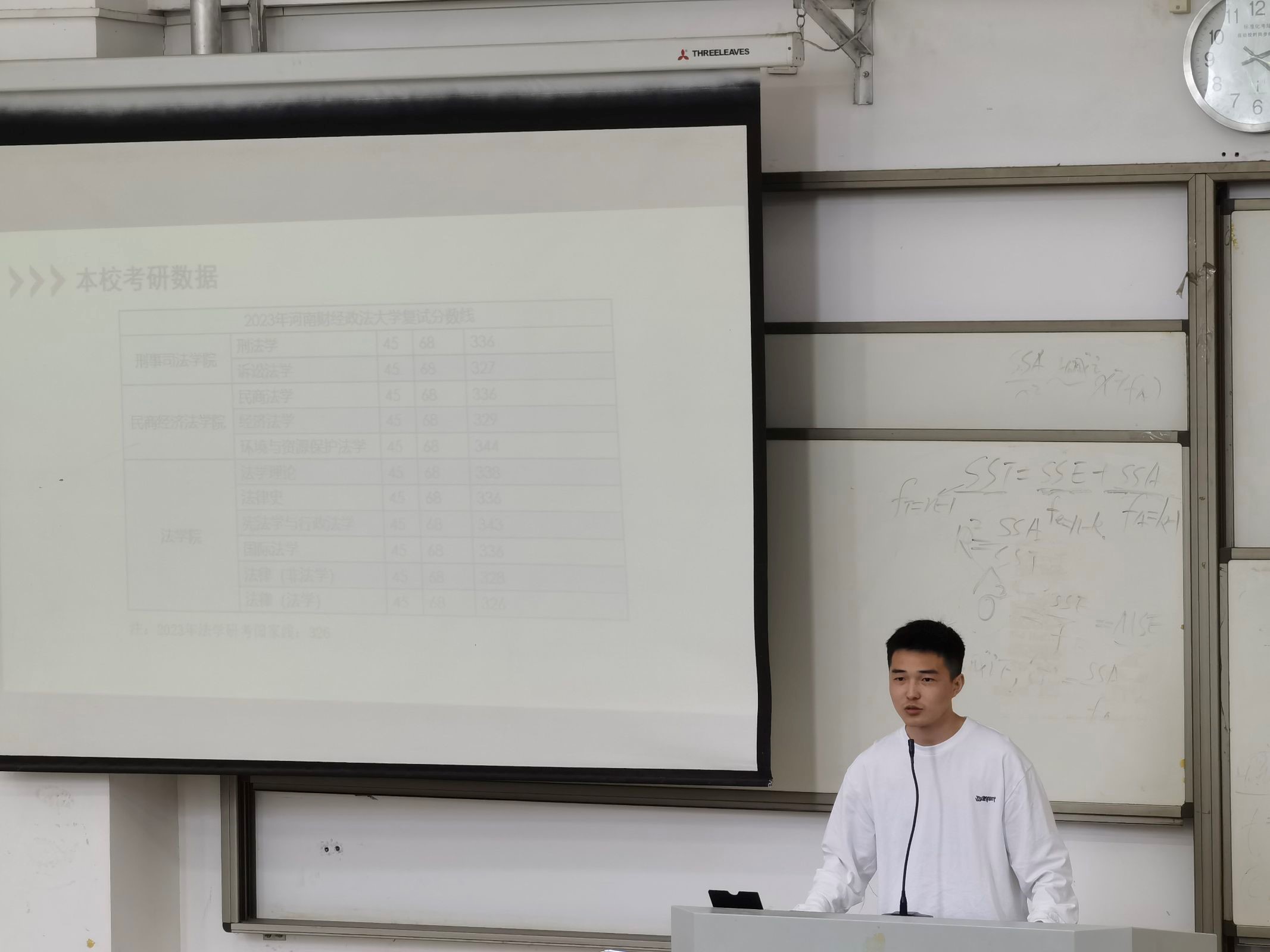 会议开始,张二军以“我为什么要考研”这一问题切入主题,引发学生对考研的思考。随后,他就学硕和专硕的区别、专业和院校的选择、考研复习规划三个方面具体讲解了考研注意事项,并倡导同学们尽早做好考研规划,力争上岸!随后,2019级考研成功的学生代表与同学们分享了考研经验。其中,成功考上对外经济贸易大学的池沁祺、中南财经政法大学的万晨颖、西南政法大学的刘佳璇、华东政法大学的杨肖青、河南财经政法大学的贺岩分别结合自身的考研经历,从择校问题、学习规划、复习方法、考试技巧、心态调整等方面向同学们提出了众多实用有效的建议,以帮助同学们明晰考研形势、坚定考研信心、掌握考研方法。会议最后,王梦秋对分享经验的优秀学长学姐表示感谢,并以“慎终如始,则无败事”激励学生们奋勇争先、一战成硕!