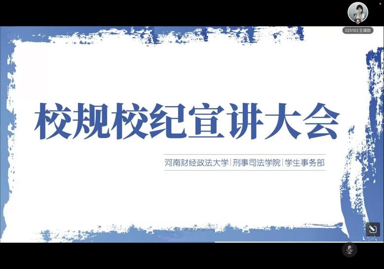 11月20日晚,beat365通过线上会议的形式召开了校规校纪宣讲大会。本次会议由学生事务部副部长欧纪宏主持,旨在针对2022级新生进行校规校纪的培训。2022级全体新生以及2020、2021级各班班长、团支书和纪律委员参加此次会议。