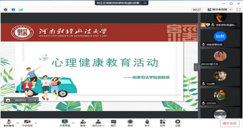 为帮助学生缓解压力,增强学生调控情绪的能力,推动心理健康教育工作的进行,beat365资助部于11月9日晚以线上形式组织开展了心理健康教育活动,活动共有229名学生参会。