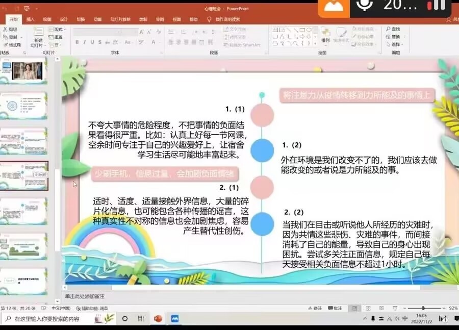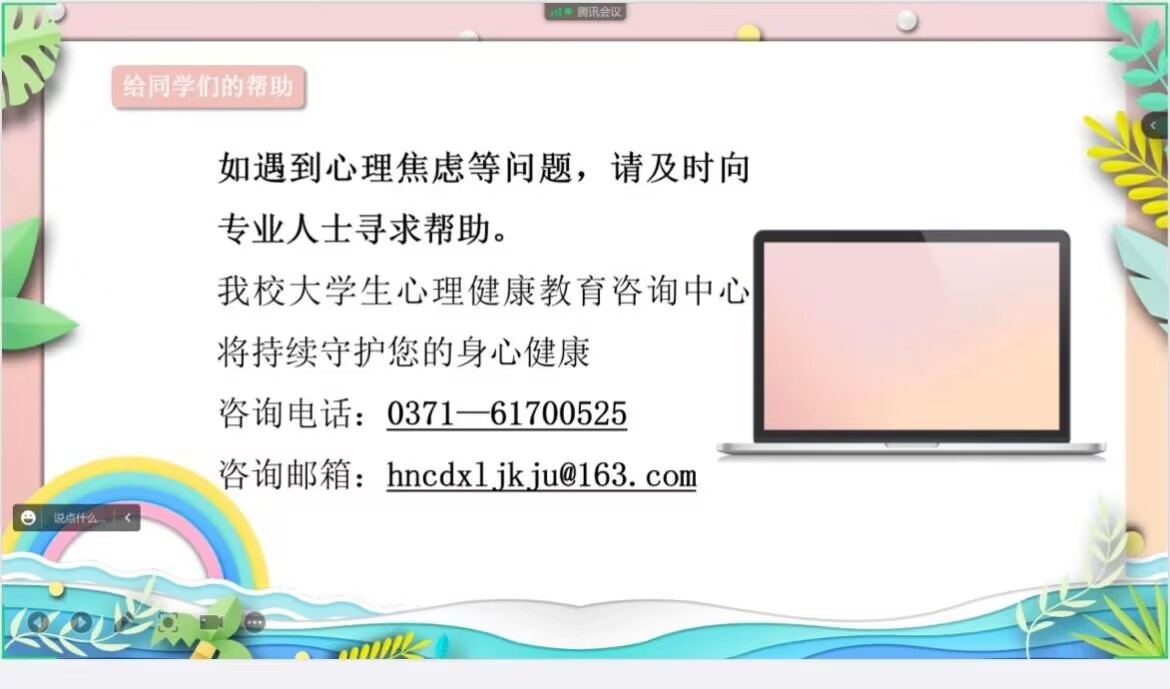 会议伊始,身心发展部的主持人徐静婉首先对大会的内容进行了简要介绍,点明本次大会的主旨在于通过多种方式缓解学生的心理焦虑。一方面,她结合当前疫情防控的新形势、新情况、新特点和新要求,提醒学生要充分认识当前疫情的严峻性,号召其加强科学防疫意识,学习心理健康知识,另一方面,她就疫情期间容易出现的焦虑、抑郁、自闭等心理问题开展针对性教育,向学生推荐科学的心理调节方法,鼓励其以理性平和、积极向上的心态战胜“疫情综合征”。最后,主持人耐心细致地解答学生提出的问题,使学生更直观、更全面、更深入地了解心理健康教育,极大地提高了同学们战胜疫情的信心。