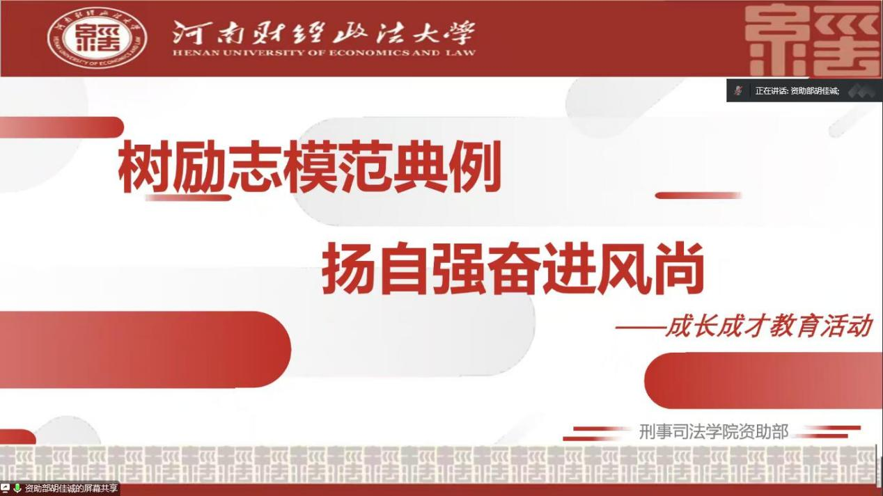 活动开始,资助部学生干部就“什么是成长,什么是成才”、“当代大学生该如何看待成长成才”等内容进行了详细讲解,并向参会学生介绍了本年度“成长成才励志典型”——215101班欧纪宏、215101班张鑫以及205103班宋晓莹三位学生。随后,三位学生结合自身经验,向大家介绍了自己对学习与生活的理解和看法。欧纪宏阐述了自己初入大学的生活经验,并向大家分享了学习方法,使学生们受益匪浅;张鑫表示大学生应当制定适合自己的规划与目标,积极挑战,充实大学生活,从而在人生中留下精彩的片段;宋晓莹回忆了自己从观摩榜样到成为励志模范的经历,并向大家分享自己学习、生活以及感情方面的经验,鼓励大家勇于试错、敢于尝新。最后,资助部向参会学生介绍了寒假期间积极投身长葛方舱实验室的王子硕和努力进取终获保研资格的张金格这两位品学兼优的学生,他们的励志故事进一步加深了学生们对“成长成才”的认识和理解。