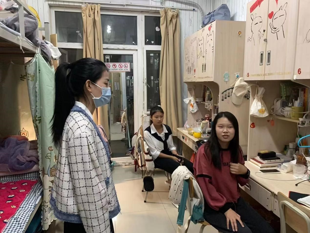 走访过程中,段肖礞向学生们再三强调了当前疫情防控的相关管理规定,提醒学生们一定要注重保护自身安全,严格落实学校疫情防控相关要求。同时,她强调到,在疫情形势下,所有党员、学生干部要发挥模范带头作用,以身作则,希望每个人都能定时参加学校组织的核酸检测,做到应检必检,为自己,也为他人的生命安全负责。针对学生行为规范,段肖礞还向他们提出了戴口罩、进出场所扫码、不串班、不串寝、不聚会、不聚餐等多项规定,并耐心叮嘱他们天气转凉后及时添加衣物,关注自己的身体健康情况,平安健康地完成学习任务。