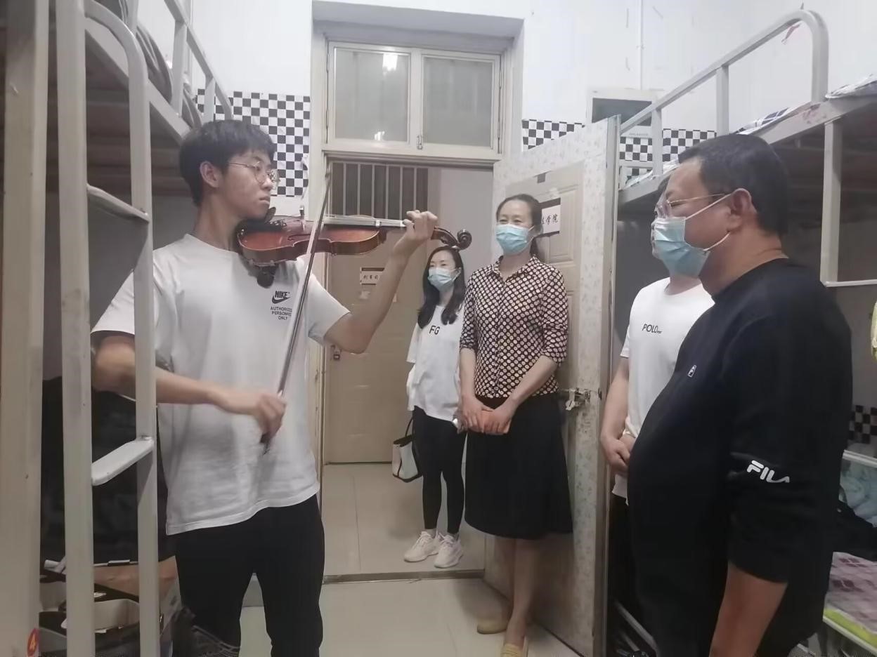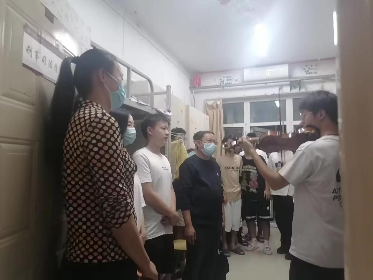 走访新生宿舍时,领导老师们很快就被房间内传出的琴声吸引住了。他们循着琴声找去,原来是22级的史译夫同学在练习小提琴。王健书记不但号召周围学生一起欣赏他的演奏,还亲自拍摄视频来记录整个过程。悠扬的琴声让在场的师生沉醉,现场气氛热烈而活跃,王健书记对史译夫同学的才艺表演表示赞赏,还借此鼓励更多的同学把握展示自我的机会,参与学校举办的各项文体活动,充实大学生活。