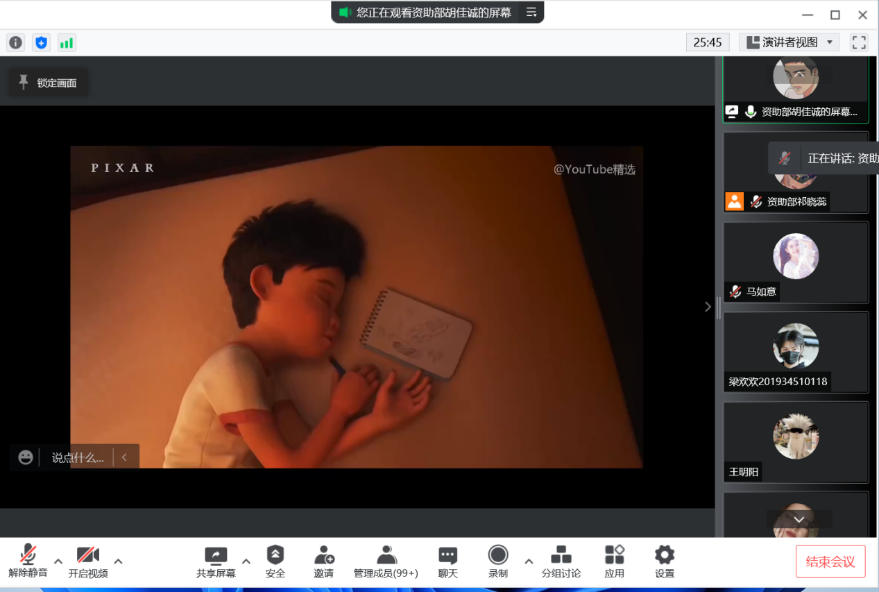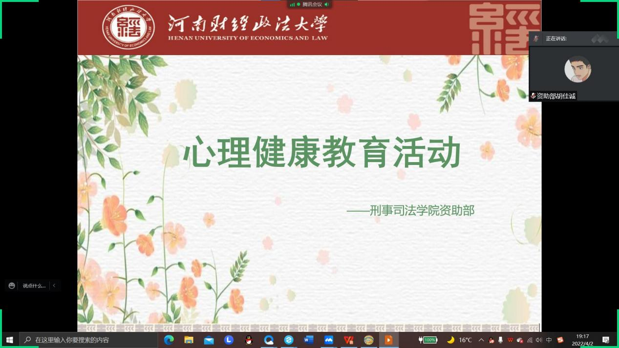 本次活动以“疫情之下,呵护心灵”为主题,段俊丽围绕疫情带来的常见心理问题、疫情下学生如何正确对待压力以及学生如何合理疏导心理问题几个方面的知识进行了详细讲解。疫情大背景下,学生因学习就业压力、活动范围受限、疫情局势多变,极易产生焦虑、恐慌等心理问题。遇到这些问题,学生要及时宣泄积郁,进行自我调整,以积极良好的心态对待不良情绪。当产生难以疏解的心理问题时应该积极寻求家人、朋友、老师的帮助,力求以科学有效的方式恢复健康的心理状态。活动的最后,段俊丽组织参会学生观看相关短片,起到了缓解压力,治愈心情的良好效果。