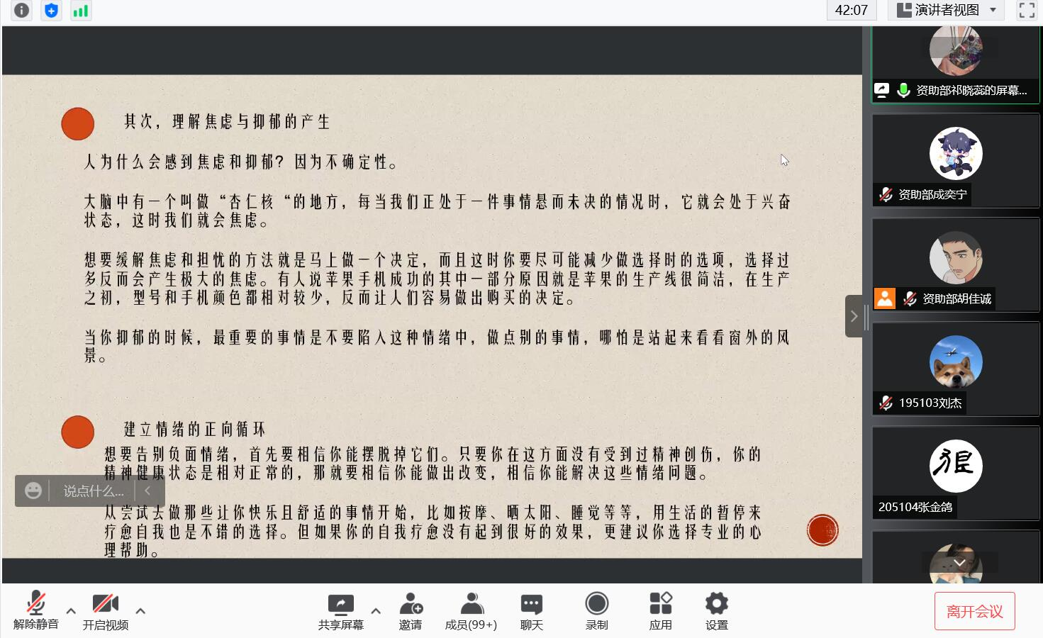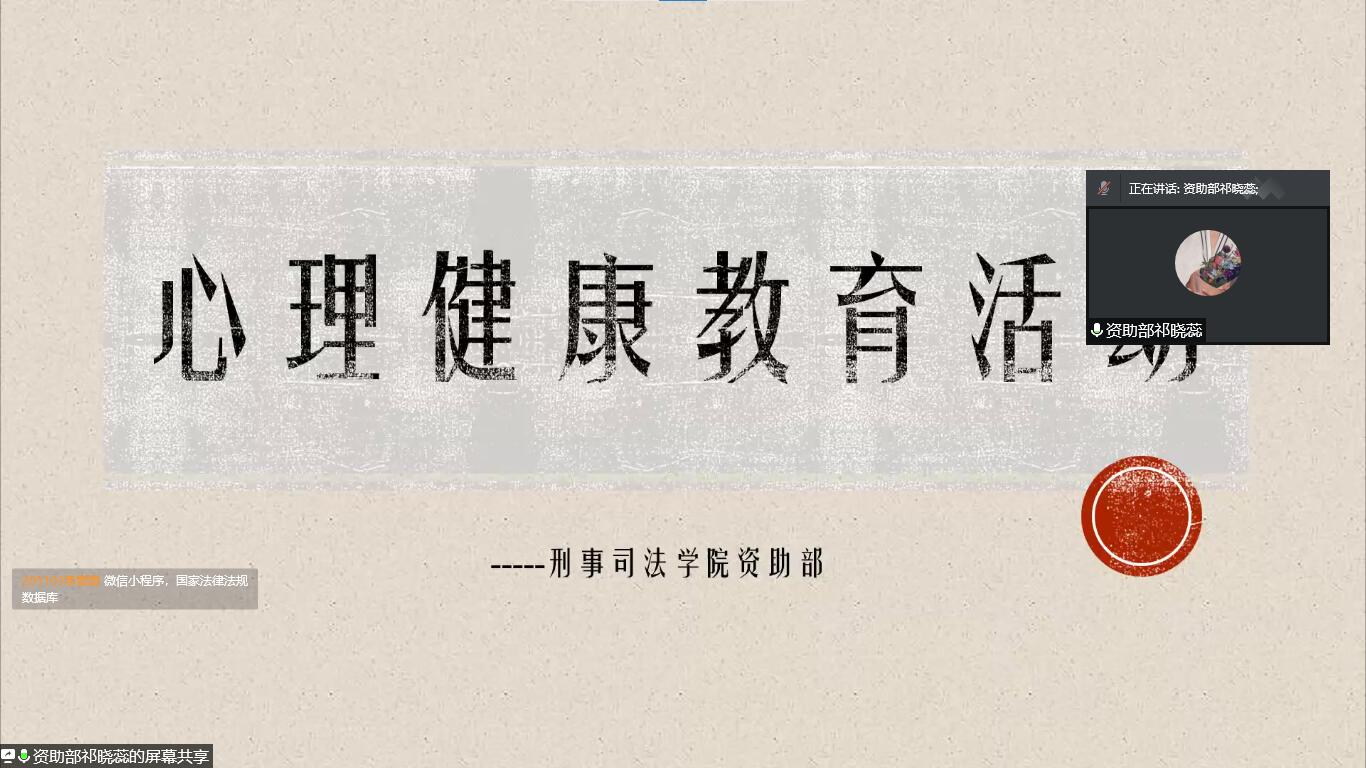 11月26日晚,beat365资助部“心理健康教育活动”在腾讯会议以线上方式举行,此次活动由资助部负责人祁晓蕊主持,全体家庭经济困难学生参与。