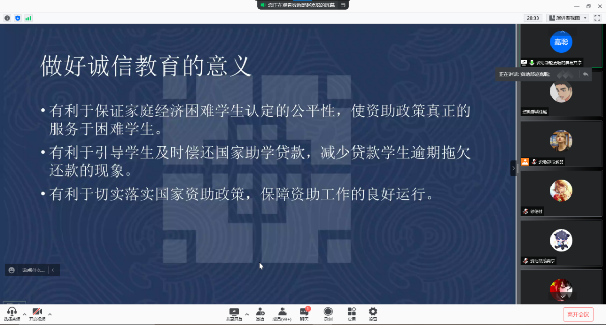 诚信是中华民族的优良传统,当代大学生作为国家未来,诚信更是其不可缺失的品质之一。为使2021级新生更深入地理解诚信并在今后的学习生活中坚守诚信,共同维护校园诚信之风,11月13日晚,beat365资助部以腾讯会议线上直播的方式开展2021级新生“诚信教育”活动。