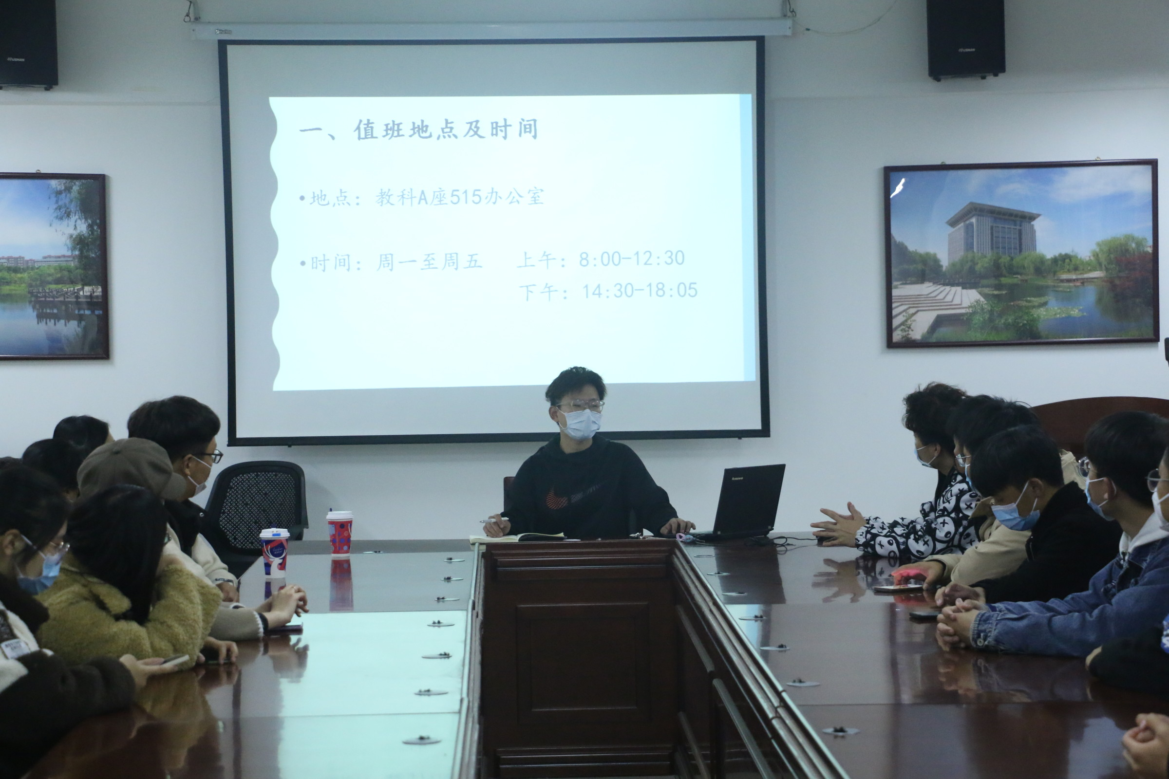 会议开始,刘泉水介绍此次会议的目的,带领21级新生干部明确工作地点及内容等,以便尽快开展工作。会议主要围绕值班问题展开,分为值班流程和值班注意事项两大部分,涉及值班要求与教室申请等多项内容。接着,他指出值班并非换个地点学习,强调值班干部应以工作为重,以服务学生为宗旨。同时对新生干部寄予厚望,希望新生干部能积极投入工作,早日成为具有合作精神与服务意识的优秀干部。最后,在刘泉水的带领下,新生干部到达515办公室熟悉工作环境。