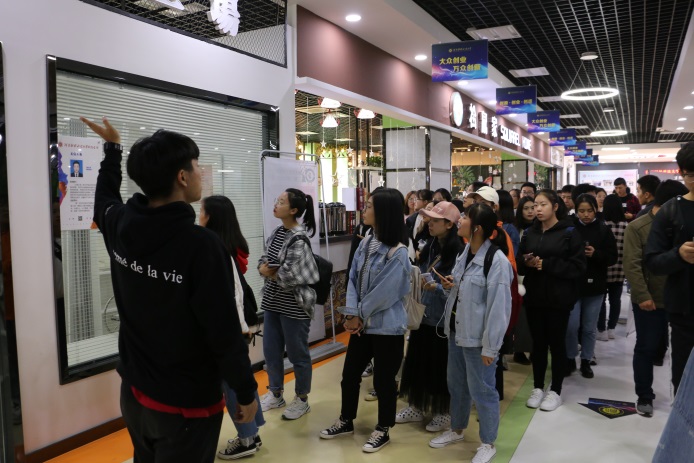 参观活动伊始,引导员首先介绍了我校校企合作单位,如中信银行、中国建设银行等,还重点介绍了我校知名创业导师。接着,大家简单了解了目前入驻众创空间的大型项目,主要有优优祝福财大印象、松鼠家、TD绘星球等等。除此之外,还有万寤工场、慕光科技、不动点科技、黑白灰科技等项目也均已入驻众创空间。最后,同学们聚集到众创空间的核心----路演厅,在这里,引导员向大家介绍了我校项目入驻的政策、条件和具体流程,鼓励同学们积极创新创业。