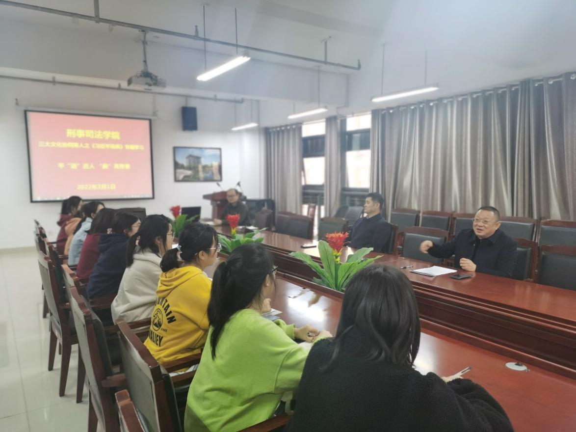 姜保忠院长强调,大学的目标是“立德树人”,我们大学教育,首先要注重学生品德的培养,“德”是我们做人的根,这个根扎的深了,我们的人生大厦才能立于不败之地。中华优秀传统文化中有许多这样的内容,《习近平用典》这本书里面专门有一篇就是“修身篇”,希望同学们以这次专题学习为契机,深入学习,全面领会,学有所用。通过加强对三大文化的教育达到“树人”的目的。同时姜院长还对活动的主题进行了生动的诠释,使大家对本次活动的意义和价值有了更加深刻的认识。他强调,通过这次学习,我们一方面要学习习近平总书记的治国理政思想,这套书里面含有丰富的思想内容,涉及各个方面,要全面学习;同时,要学习习近平总书记的读书和学习精神。总书记指出:“读书可以让人保持思想活力,让人得到智慧启发,让人滋养浩然之气。”同学们通过阅读经典,加强自身修养,努力学习专业知识,成为新时代社会主义合格建设者和接班人,为国家法治建设贡献自己的青春和力量。